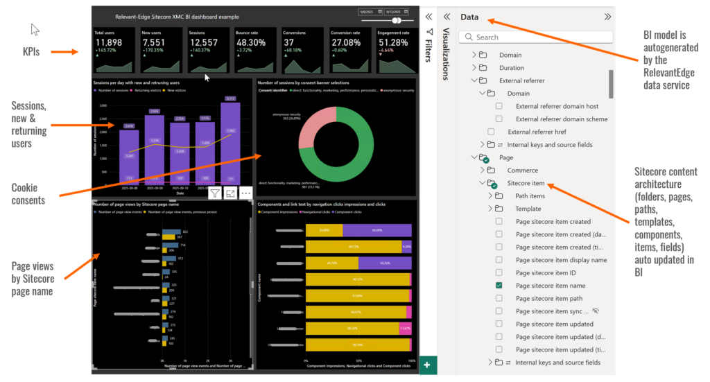 For example, when a new page, form or event site is added to the Sitecore XMC implementation, no manual work is needed to see BI insights for these elements when published.