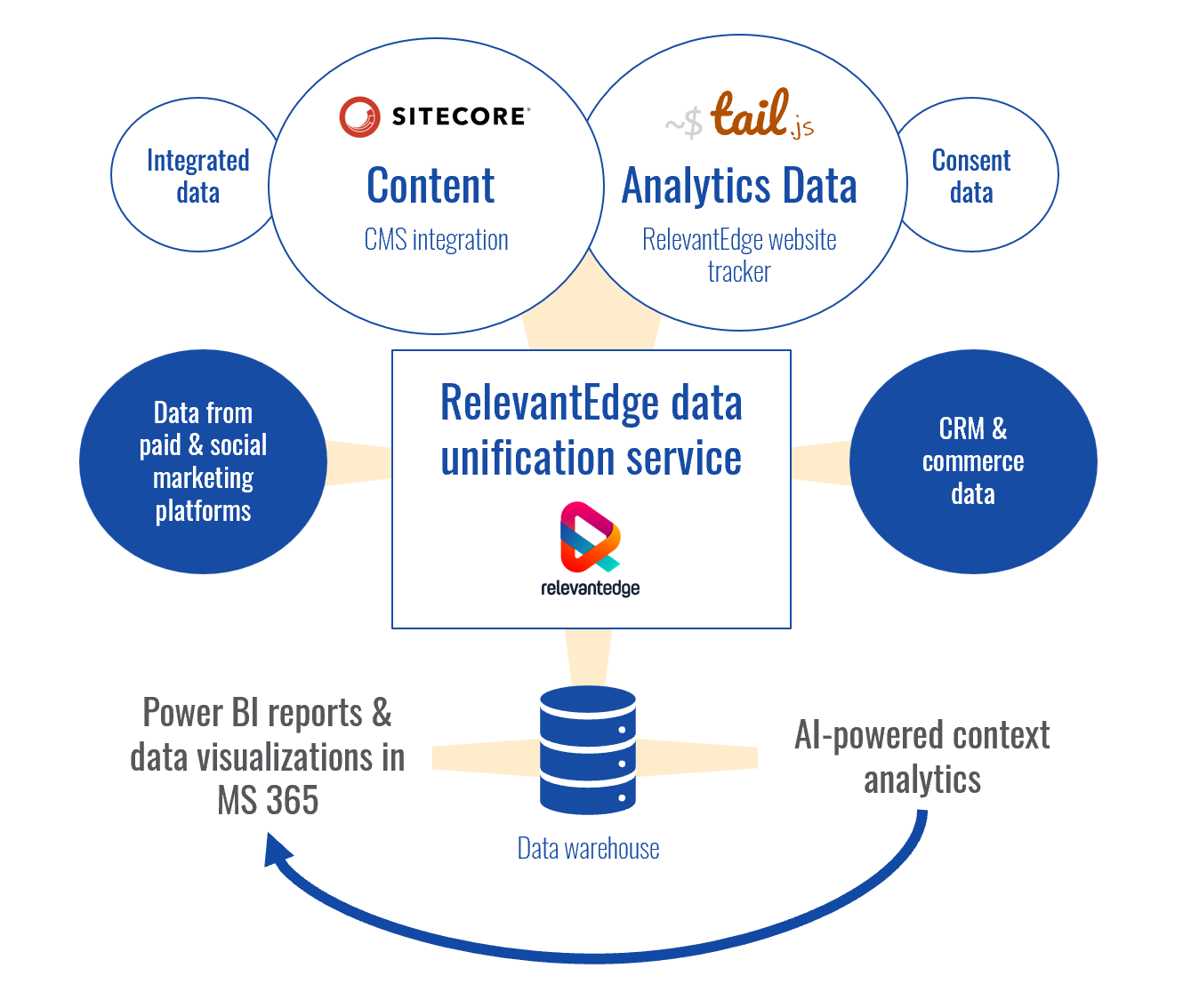 The RelevantEdge solution includes an SQL data warehouse containing unified website and marketing data.